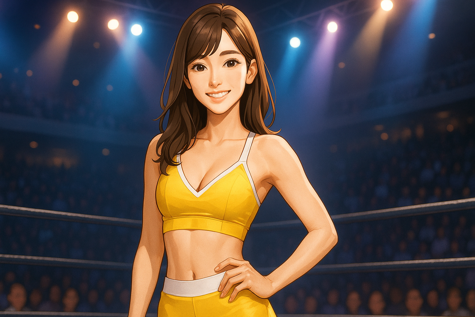 試合会場でラウンドガールとして登場した彼女は、黄色い衣装に身を包み、カメラに向かって堂々とファイティングポーズ。